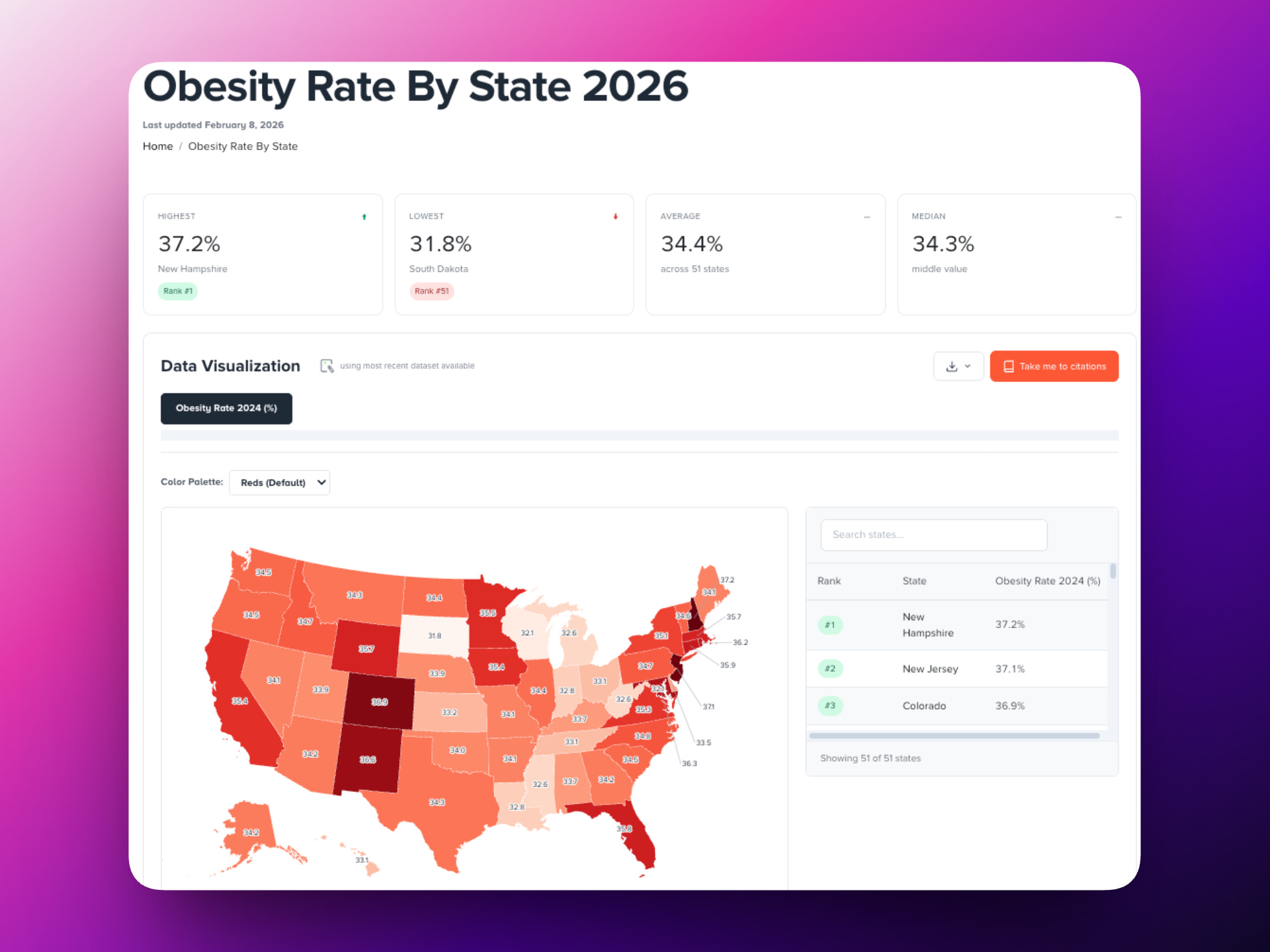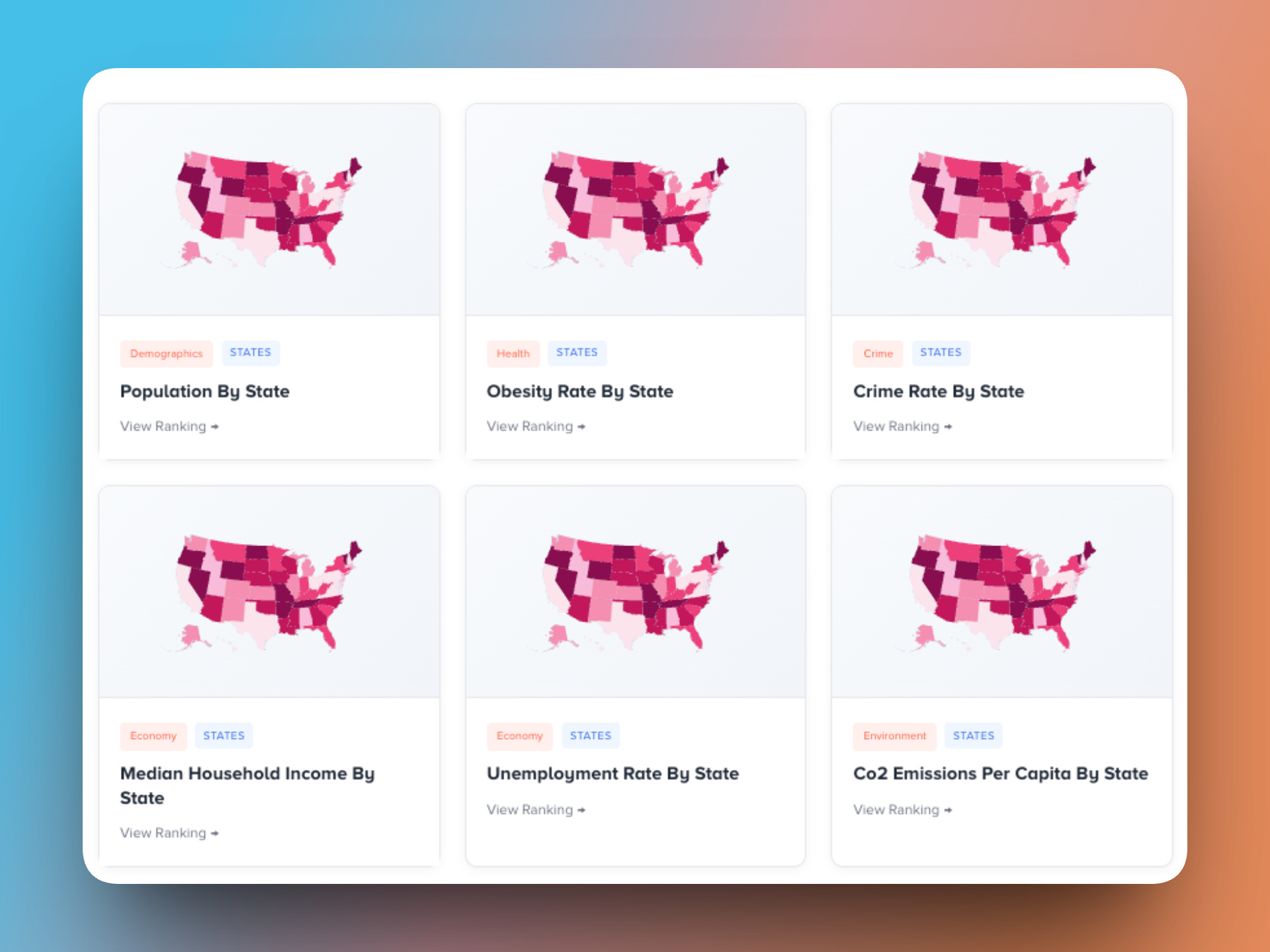 State-level topics aren’t just tables. Each one leads to an interactive map, a full ranking, and data you can actually explore. Population, obesity, income, crime, CO₂ emissions — it’s all there to easily digest…we hope.