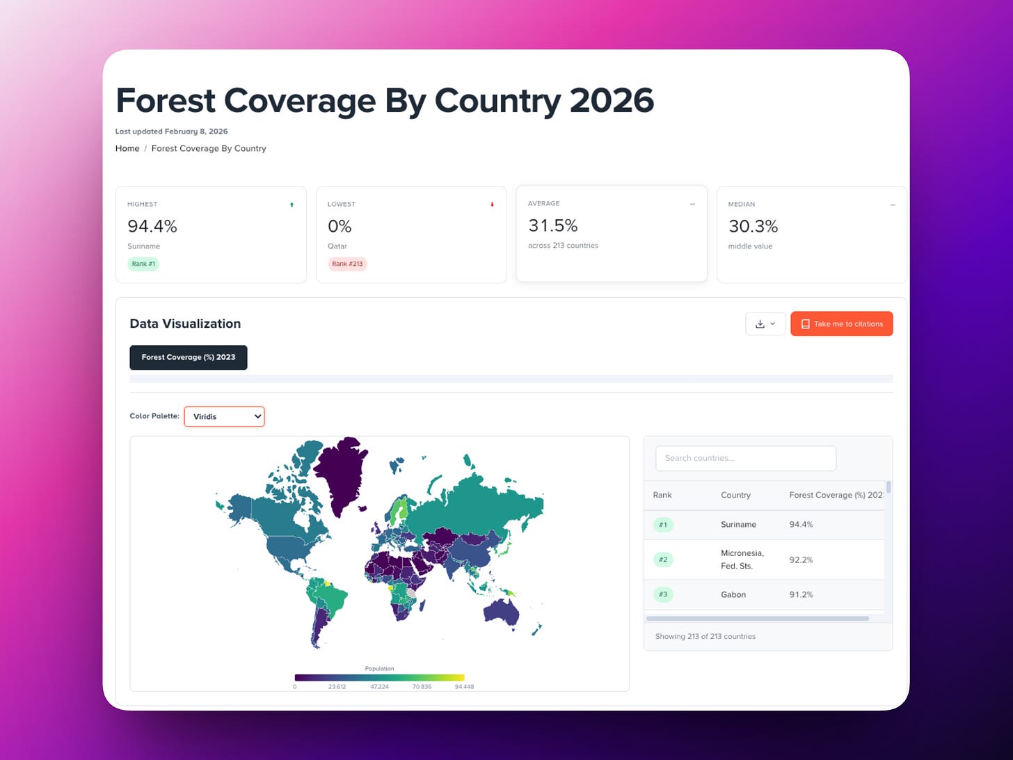 The same experience that powers state pages applies globally. Forest coverage, population, economics, health — with color palette options, source citations, and export tools built in.