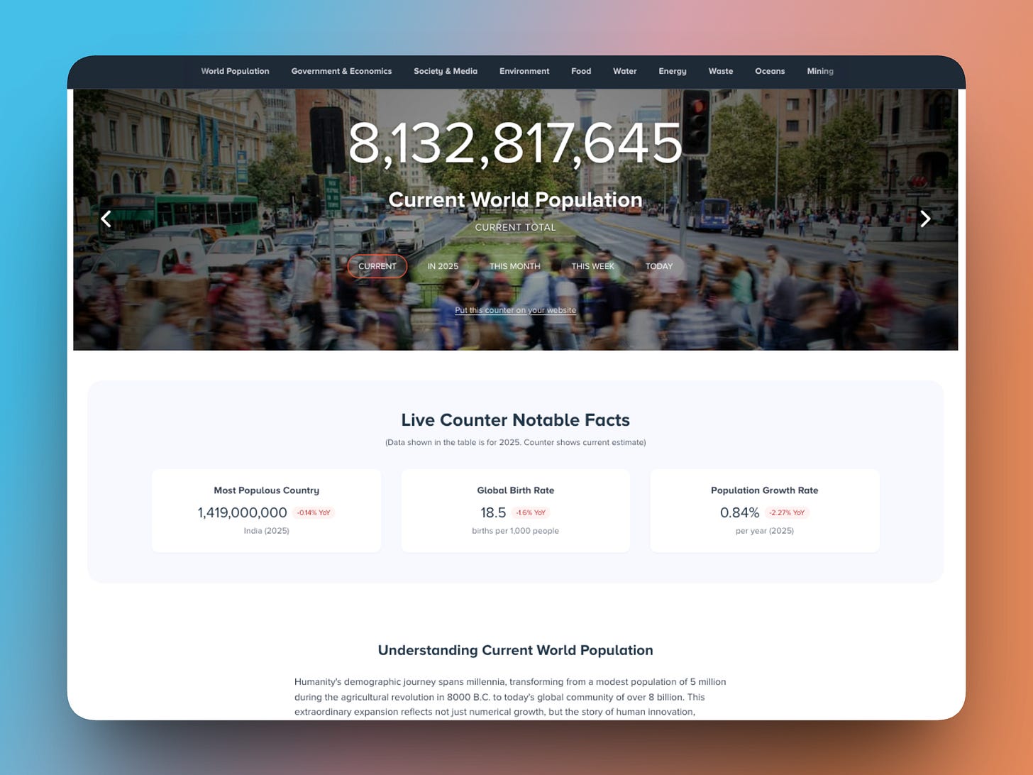 This is one of the features people come back to, our most popular section on the site by FAR. Real-time statistics — births, deaths, population growth, energy use — updating live, every second.