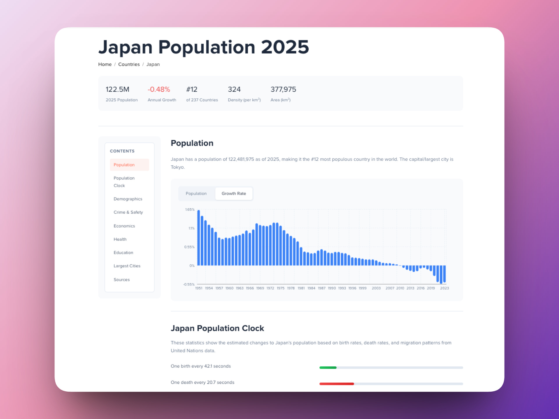 Japan’s population is shrinking. You can see exactly how fast — and why — through the population clock (most accurate animated clock out there), growth rate charts going back to 1951, and a full breakdown across demographics, crime, economics, health, and more.