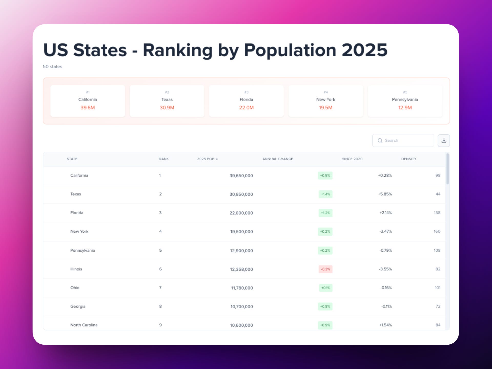 Sort, search, and download. State rankings include annual change, growth since 2020, and density — all in one clean view.