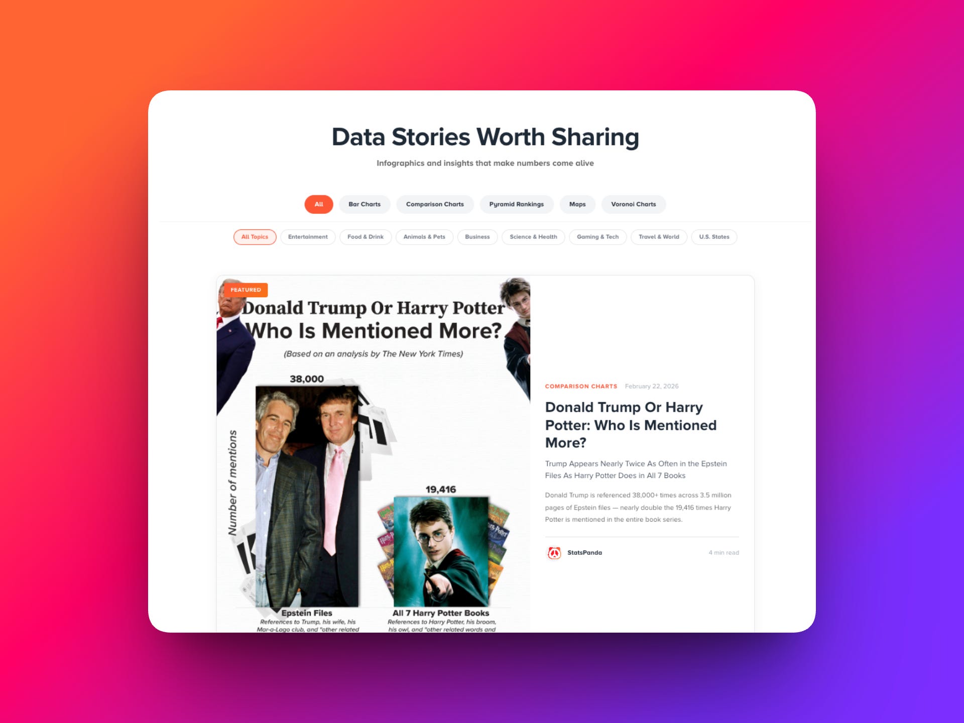 “Trump or Harry Potter: Who Is Mentioned More?” went live yesterday. The Data Stories section is now a full editorial channel on the site — filterable by chart type and topic. Subscribers get every new story in their inbox. The site gets a permanent home for them.