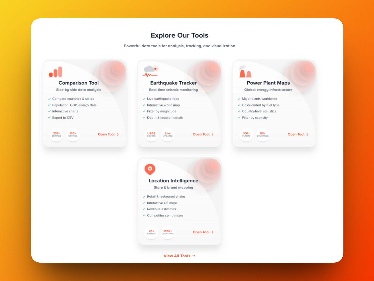 Beyond data pages, the platform now features dedicated tools: a Comparison Tool for side-by-side country and state analysis, an Earthquake Tracker with live USGS data, Power Plant Maps across 50+ countries, and the new Location Intelligence tool for mapping retail chains and brands across the US.
