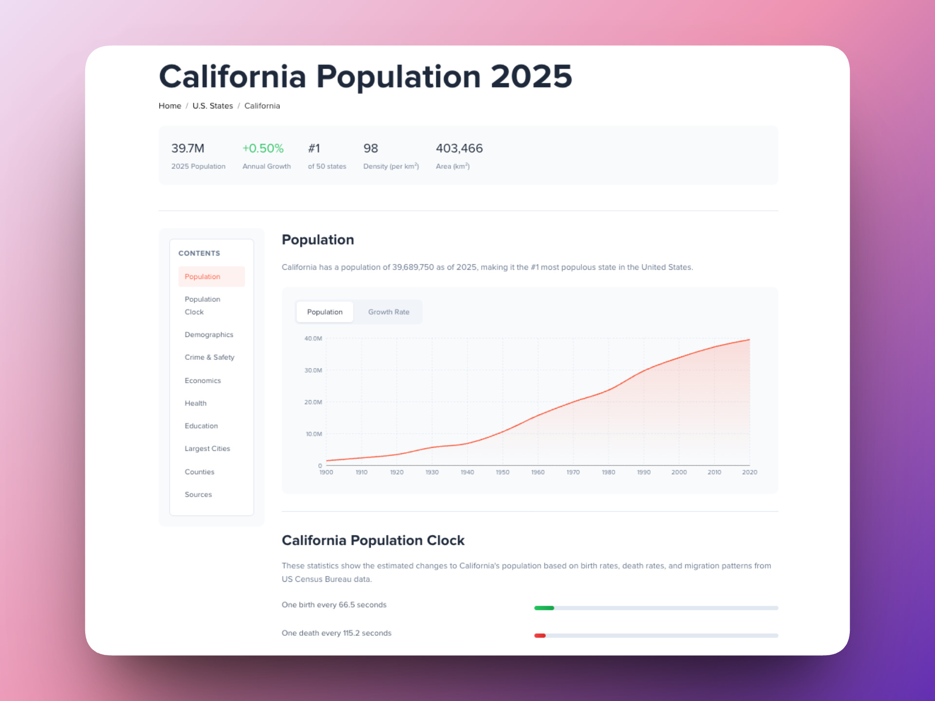 California’s page doesn’t just tell you it has 39.7M people. It shows you the trajectory since 1900, the live population clock (one birth every 66.5 seconds), and links directly into counties — a layer we just expanded significantly.