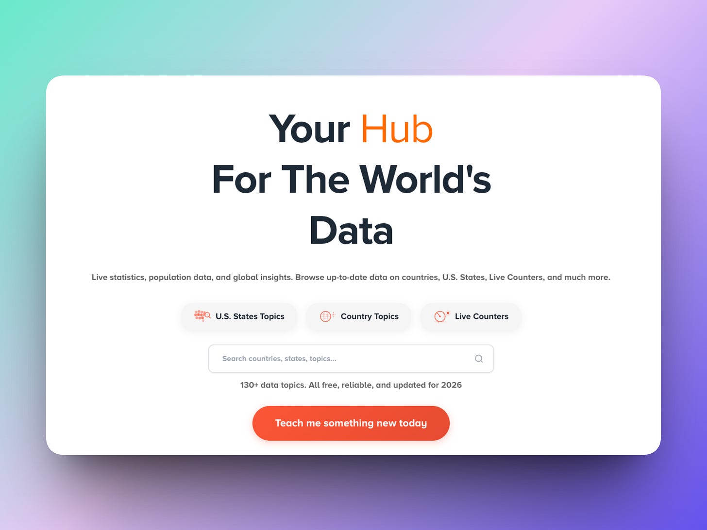 The homepage puts everything within reach: U.S. State topics, Country topics, Live Counters, and a search bar that pulls from 130+ data topics. All free, reliable, and updated for 2026.