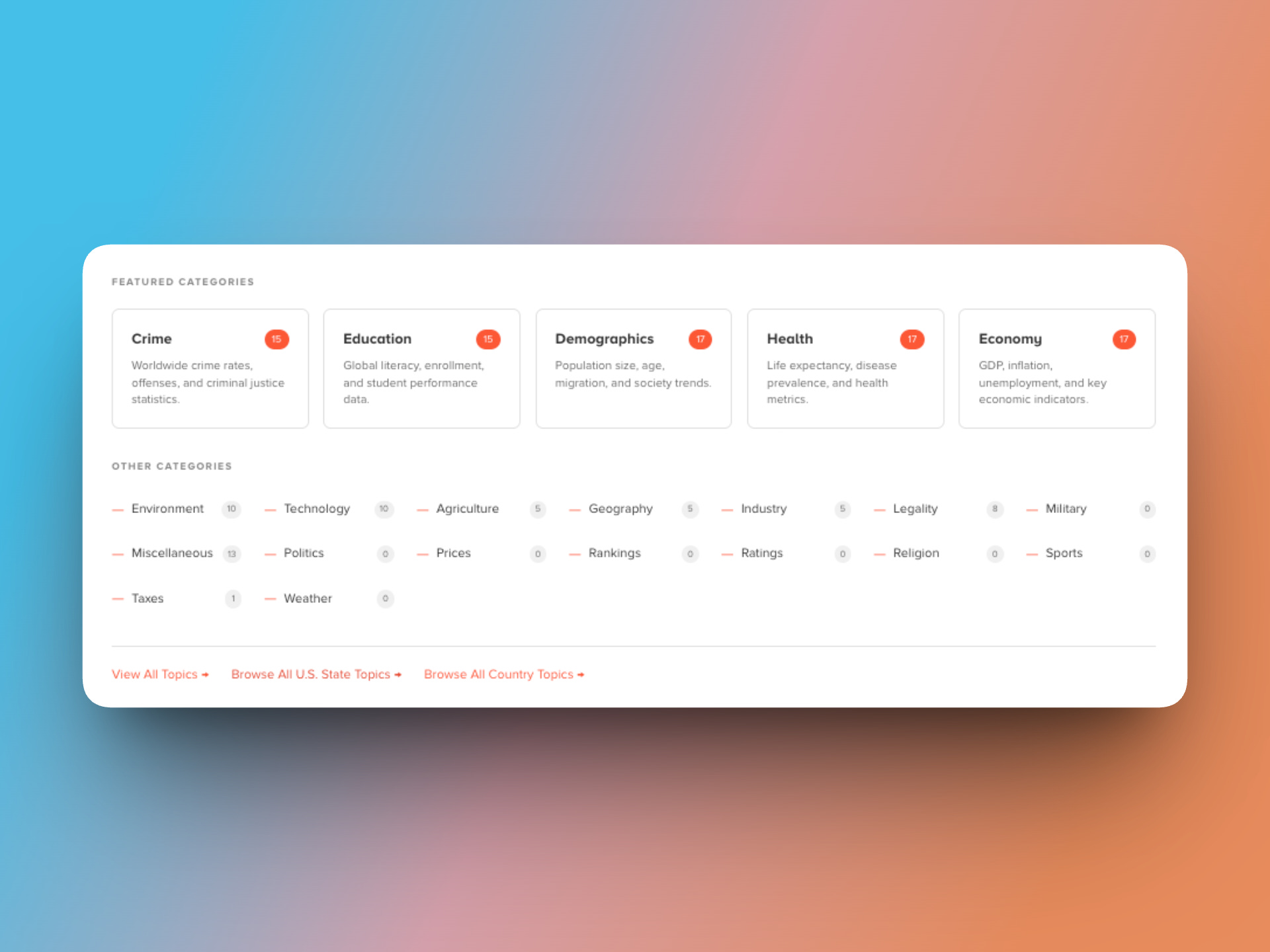 From Crime and Education to Health, Economy, and Demographics — every topic is organized into categories with topic counts so you always know what’s available. The “Other Categories” section is filling in fast and we are CONSTANTLY adding new data topics.